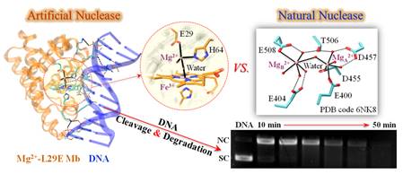 人工核酸酶分子在生物技术和生物医药领域,特别是在基因工程和新型抗菌抗病毒等试剂的发现中具有重要的应用。然而,很少有人工核酸酶分子既能切割又能降解核酸DNA分子。近日,beat365林英武教授课题组在国际催化领域权威杂志《ACS Catalysis》(中科院一区; IF=12.35)发表研究成果——《Rational Design of an Artificial Nuclease by Engineering a Hetero-Dinuclear Center of Mg-Heme in Myoglobin》,同时申请了国家发明专利。