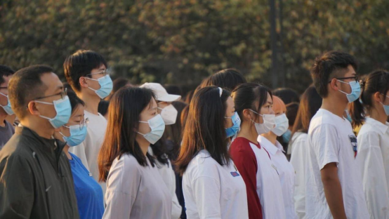 仪式第一项,升国旗,奏唱国歌,行注目礼。国旗班踏着整齐有力的步伐出旗,在庄严肃穆的国歌声中,全体师生行注目礼。