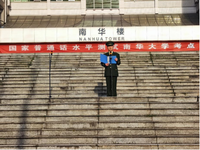 退伍老员工代表化卓2101班喻江浩进行国旗下演讲。他向全体同学发出号召:“我们生逢盛世,当不负盛世,我们要努力学习,传承红色基因,为中华民族伟大复兴贡献我们的青春力量。当前公司迈入新发展阶段,以新思想、新举措助推公司双一流建设,身为南华学子同样要为公司双一流建设贡献我们的青春力量。”