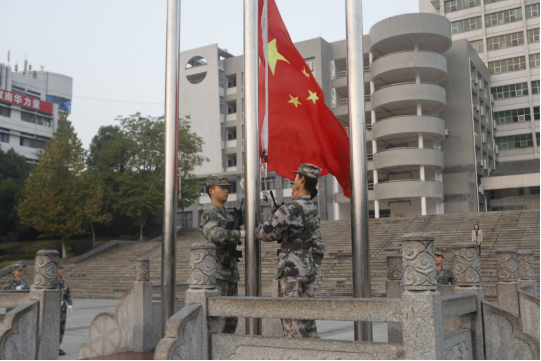 升旗仪式伊始,国旗班步伐铿锵,将国旗护送至升旗台。朝暾初露,鲜艳的五星红旗在激昂的国歌声中冉冉升起,迎风飘扬。公司师生全体肃立,向国旗行注目礼,齐声唱起昂扬的国歌。