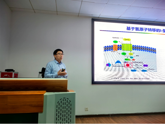 杨清正教授作了题为“Ⅰ-型光动力治疗光敏剂”学术报告,他聚焦光动力治疗的乏氧瓶颈,系统阐述Ⅰ-型光敏剂的设计策略,如何阻断与分子氧的能量传递、分子组装促进电子转移,其中包括光诱导歧化、引入电子给体和受体,并介绍了基于氢原子转移的Ⅰ-型光敏剂研发突破,其成果可在缺氧的条件下实现高效的活性氧生成以及肿瘤治疗能力。