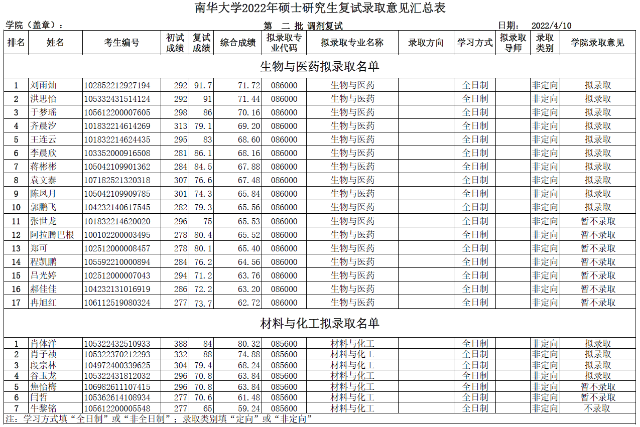 鉴于考生吴璐璐(102512000007064)王云龙(105042109909784) 钱基君(105582290101163)王梦佳(104252540004018)丁晨麓(103582210001593)李大康(105322431812014) 任远航(102462330712574)放弃录取名额,按照公司及公司研究生招生工作的复试方案,根据2022年4月10日的复试成绩排名,现公布最终拟录取名单如下。对复试成绩及上述同学的建议录取有异议,请以书面形式于2022年4月16日前向公司反映。反映情况要实事求是,具体真实,署真实姓名,以便调查核实。电话:0734-8282375,联系人:王老师。