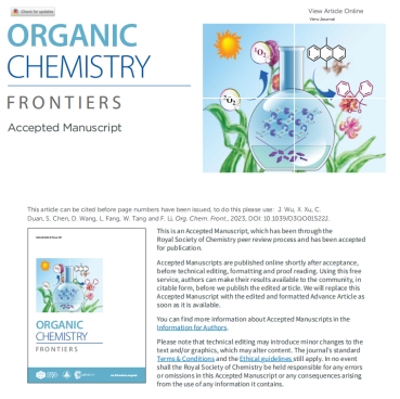 公司李富盛博士在光催化高炔丙醇的选择性合成研究中取得新成果,研究成果《Diastereoselective 1,2-difunctionalization of 1,3-enynes enabled by merging photoexcited Hantzsch ester with chromium catalysis》(DOI: 10.1039/D3QO01522J)在线发表在化学领域Top期刊《Organic Chemistry Frontiers》(中科院大小类均为1区)。其中公司20级制药工程专业吴佳同学为论文的第一作者,21级制药工程专业段崇文、陈姗、王丹、方立馗同学也参与了相关工作,李富盛博士为该论文的唯一通讯作者,beat365为该论文的唯一通讯单位。