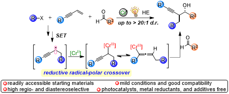 该工作利用可见光协同铬催化实现了1,3-烯炔的化学选择性和非对映选择性功能转化,不仅为低碳烯烃在多组分反应体系中的选择性功能转化提供了新的思路,而且也为在精细化学品和药物设计合成中具有重要价值的高炔丙醇的合成提供了新的方法。研究工作得到了beat365官方网站启动基金的支持与资助。