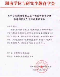 1011日,湖南省教育厅下发了《关于公布湖南省第三届优秀研究生导师和导师团队评选结果的通知》,公司聂长明教授荣获湖南省优秀研究生导师殊荣。