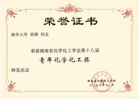 胡蓉博士荣获湖南省化学化工学会第十八届青年化学化工奖