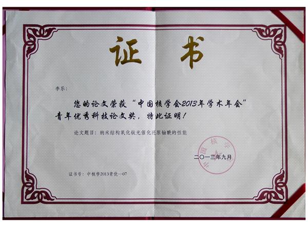 公司赵玉宝教授研究组参加了这次学术会议,并在“核化工”分会作了题为《纳米结构氧化钛光催化还原铀酰的性能》的口头报告,该论文被评为青年优秀科技论文奖(核化工分会共有两篇获奖论文)。