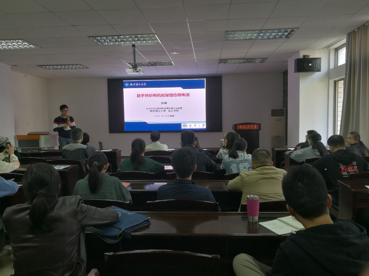 2020年10月22日上午9点,由科学与团队建设部主办、化学与化工公司承办的“beat365官方网站合并组建20周年暨建校62周年系列学术讲座”,邀请到张根教授在化工楼411学术报告厅作了题为《基于共价有机框架固态锂电池》的专题报告,报告由化学化工公司经理林英武教授主持,化工公司和其他院系教师以及研究生等60余人聆听了本次讲座。