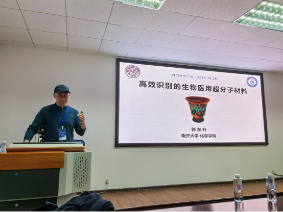 2024年10月26日,公司邀请南开大学化学公司郭东升教授以高效识别的生物医用超分子材料为题在化工楼学术报告厅进行学术报告。本次活动由公司王宏青教授主持,胡蓉副教授、黄俊副教授等师生参加会议。