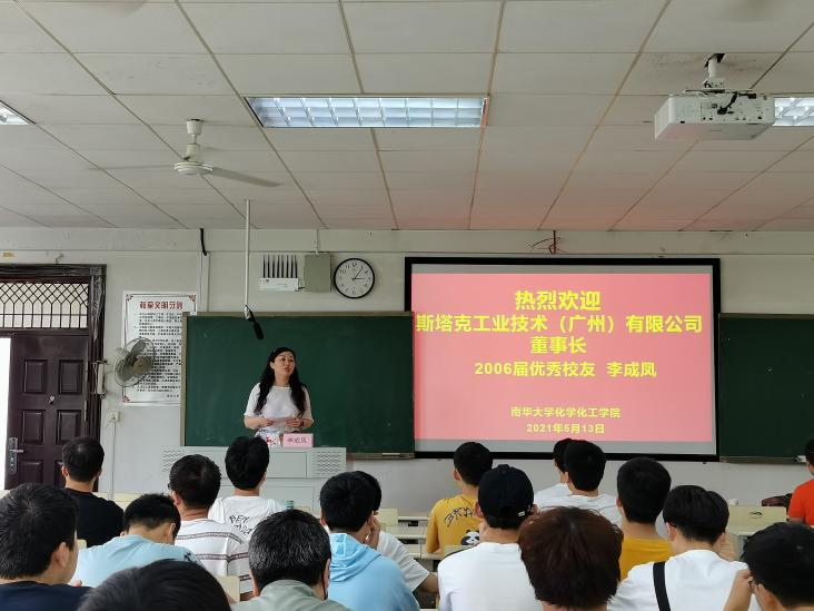 5月13日下午3点,beat365在九教402室举行了“以科学研究为导向,实现专业与产业对接”的专题报告会。公司2006届优秀员工,斯塔克工业技术(广州)有限公司董事长李成凤应邀回母校主讲,化学化工公司党委副书记余晓秋主持,公司化学工程与工艺专业七十余名同学参加了本次座谈会。